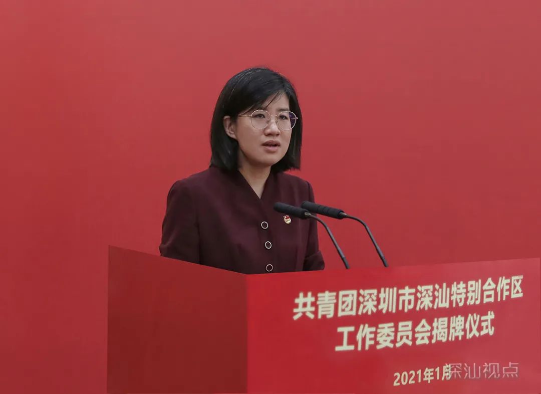 她表示,2021年是深圳共青团的“深化改革落地年”、深港青年交流深化年,青年工作将迎来新的发展。深汕合作区团工委的成立,标志着在全市共青团组织建设中,添加了深圳第“10+1”区这最后一块、也是非常重要的一块版图,将为全市共青团的深化改革再添新助力,也夯实了深汕合作区共青团工作基础,空间广阔,大有可为。她勉励区团工委要围绕中心、服务大局,为高标准规划建设深汕贡献青年力量;要坚持需求导向,激励和保障广大青年融入深汕、扎根深汕、建功深汕,努力打造青年成长发展友好城区;要加强队伍建设,勇做走在时代前列的奋进者、开拓者、奉献者。