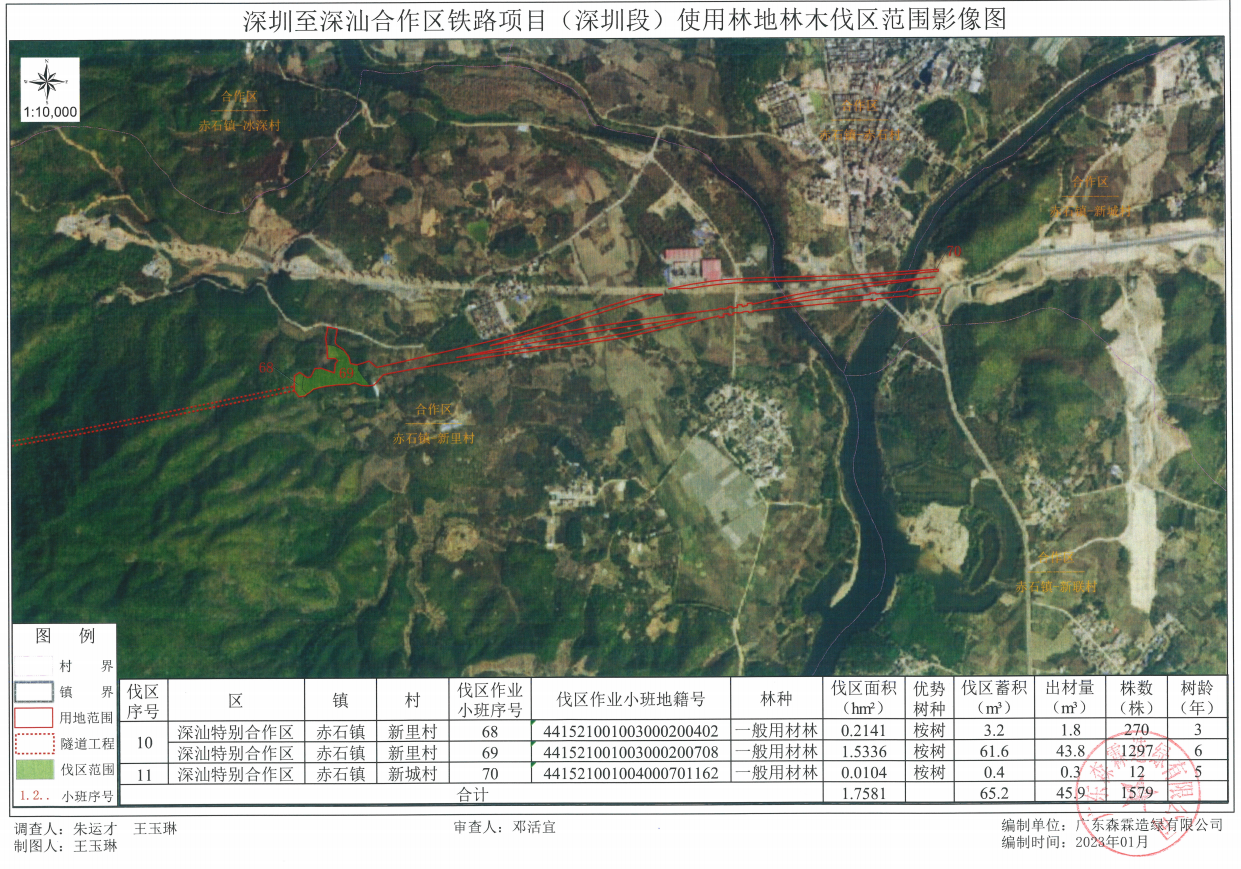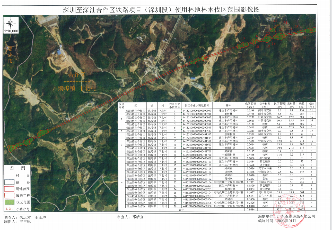 现有深圳市地铁集团有限公司因深圳至深汕合作区铁路项目(深圳段)工程永久用林申请林木采伐需要向深圳市深汕特别合作区城市管理和综合执法局申请林木采伐,申请采伐地点:深圳市深汕特别合作区鹅埠镇上北村委、镇林场、下北村委,赤石镇新城村委、新里村委(详见下表及采伐设计图),采伐树种为阔叶混交林、针阔混交林、桉树、其他硬阔、速生相思、其它木本果树、荔枝、湿地松、茶叶,采伐面积23.8458公顷(22097株),采伐蓄积888.1立方米,采伐类型:其它采伐,采伐方式:皆伐。