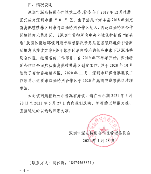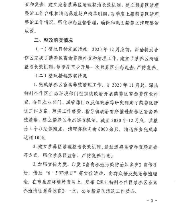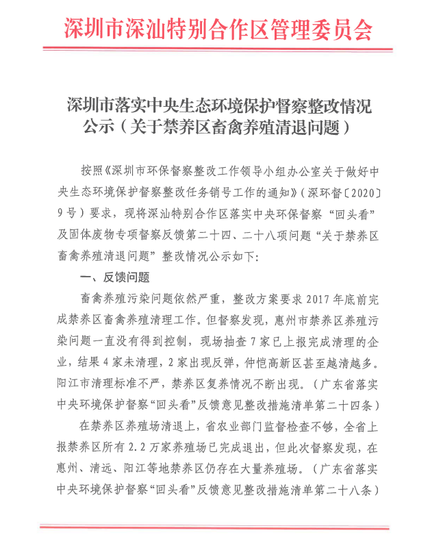 深圳市落实中央生态环境保护督察整改情况公示(关于禁养区畜禽养殖清退问题)