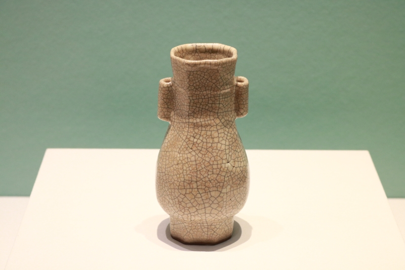 图为故宫博物院藏宋代哥窑米黄釉贯耳瓶。