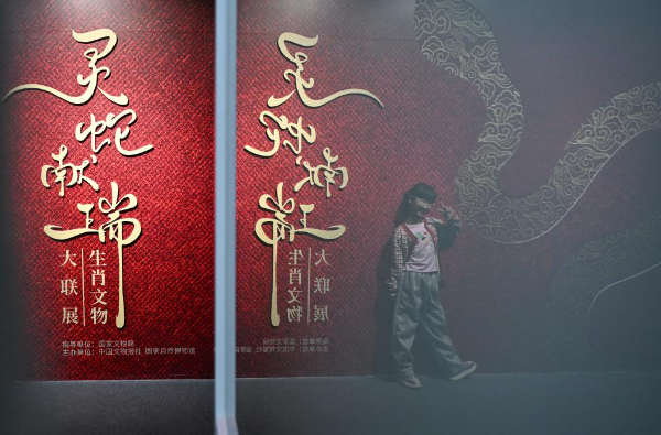 1月18日,一名小朋友在国家自然博物馆举办的“灵蛇献瑞——2025乙巳蛇年生肖文物大联展”展览中拍照留念。(新华社记者 陈钟昊 摄)