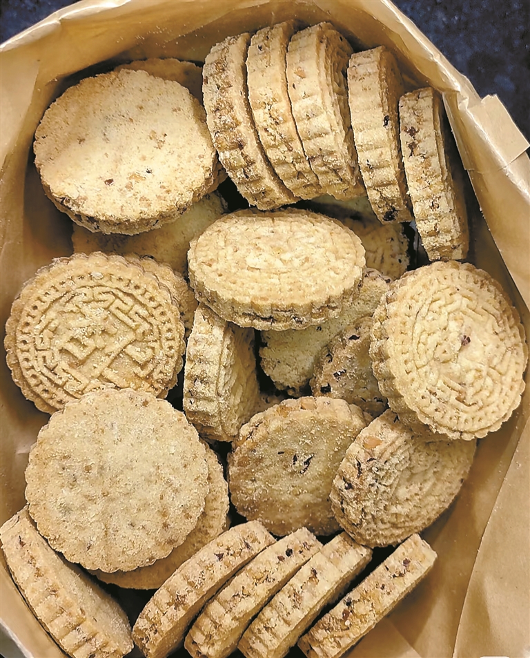 传统工艺制作出的打米饼,保留了食材最本真的香甜酥脆,质地紧密,充满花生芝麻香气,刚出炉时,香气四溢。入口轻咬,米香、糖香与花生香相互交融,美妙滋味在舌尖上跳跃。