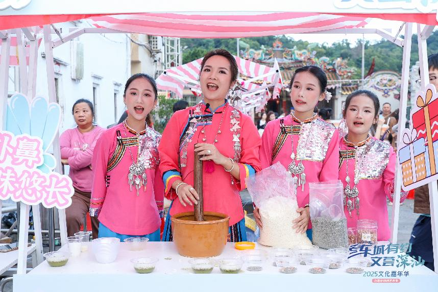 “来尝尝刚捣好的擂茶!”“疍” 味美食坊前,手艺人手持茶杵不停捣茶,茶叶、芝麻、花生的香气弥漫在空气中,吸引不少市民驻足。