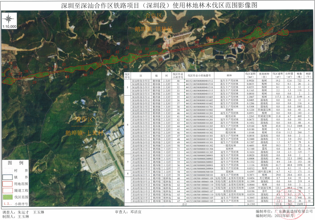 现有深圳市地铁集团有限公司因深圳至深汕合作区铁路项目(深圳段)工程永久用林申请林木采伐需要向深圳市深汕特别合作区城市管理和综合执法局申请林木采伐,申请采伐地点:深圳市深汕特别合作区鹅埠镇上北村委、镇林场、下北村委,赤石镇新城村委、新里村委(详见下表及采伐设计图),采伐树种为阔叶混交林、针阔混交林、桉树、其他硬阔、速生相思、其它木本果树、荔枝、湿地松、茶叶,采伐面积23.8458公顷(22097株),采伐蓄积888.1立方米,采伐类型:其它采伐,采伐方式:皆伐。