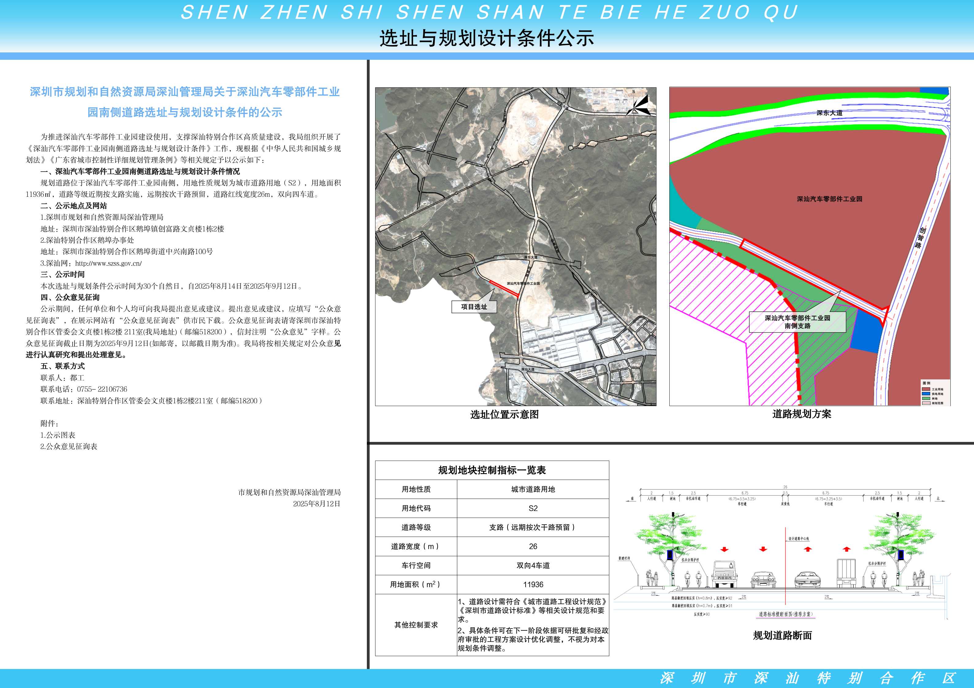 为推进深汕汽车零部件工业园建设使用,支撑深汕特别合作区高质量建设,提升沿线片区管网等市政设施保障能力,支撑片区城市开发建设和产业布局发展,我局组织开展了深汕汽车零部件工业园南侧道路选址与规划条件研究工作,现根据《中华人民共和国城乡规划法》《广东省城市控制性详细规划管理条例》等相关规定予以公示如下: