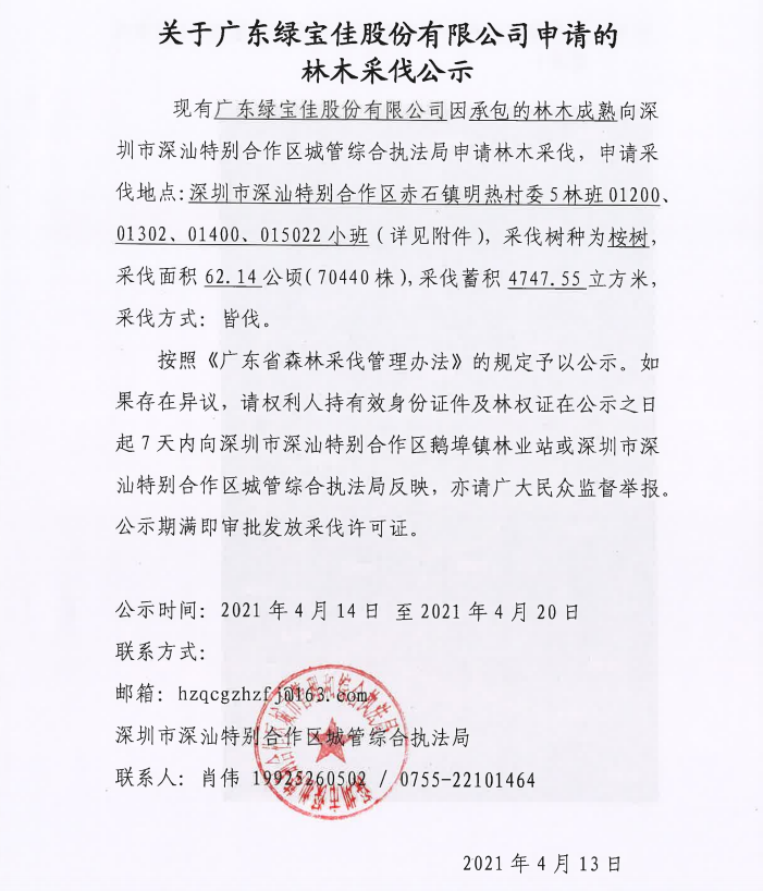 关于广东绿宝股份有限公司申请的林木采伐公示