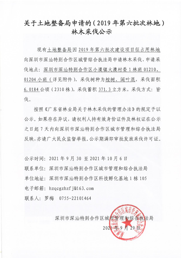 关于土地整备局申请的(2019年第六批次林地)林木采伐公示