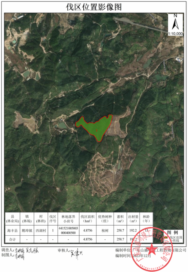现有吴丹平因个人所有林木成熟需更新改造向深圳市深汕特别合作区城市管理和综合执法局申请林木采伐,申请采伐地点:鹅埠镇西湖村委庭寮背村,地籍号:441521005003000400500(详见附件),采伐树种为桉树,采伐面积4.8756公顷(2800株),采伐蓄积258.7立方米,采伐类型:更新采伐,采伐方式:渐伐,采伐强度:50%。伐区更新造林树种配置:枫香17株/亩、樟树17株/亩、荷木17株/亩。