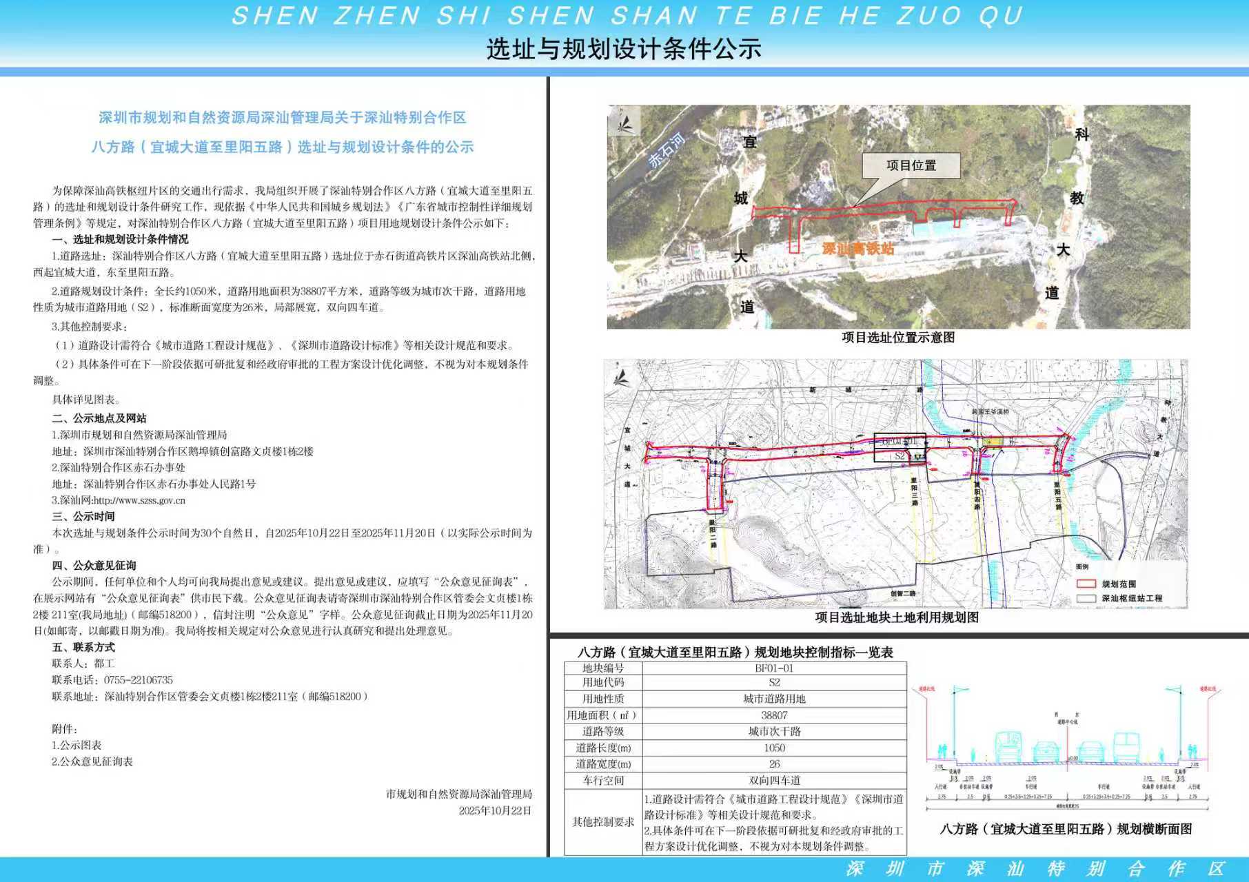 为保障高铁枢纽片区交通出行需求,我局组织编制了深汕特别合作区八方路(宜城大道至里阳五路)选址与规划设计条件,现根据《中华人民共和国城乡规划法》《广东省城市控制性详细规划管理条例》等相关规定予以公示如下: